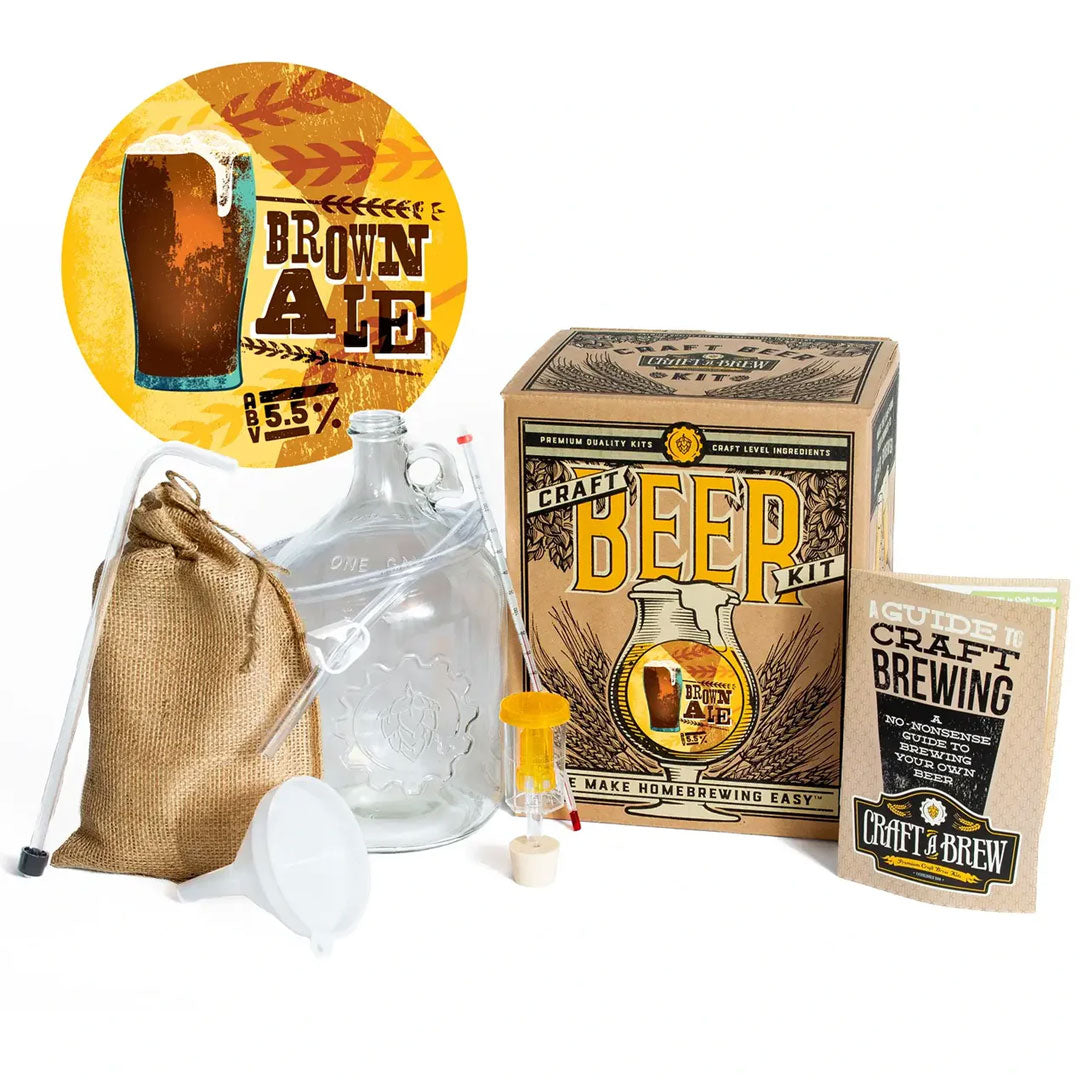 Inside the kit you will find a glass carboy, funnel, racking cane, rubber stopper, transfer tubing with thumb clamp, airlock, thermometer, sanitizer, and a step-by-step Guide to Craft Brewing. The included Brown Ale Recipe Kit features premium brewing ingredients that create a balanced beer with rich malt flavor and gentle hop bitterness.